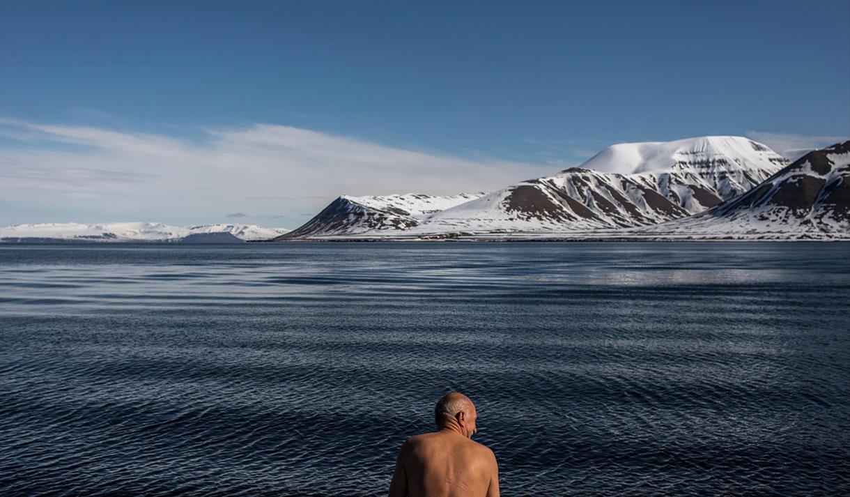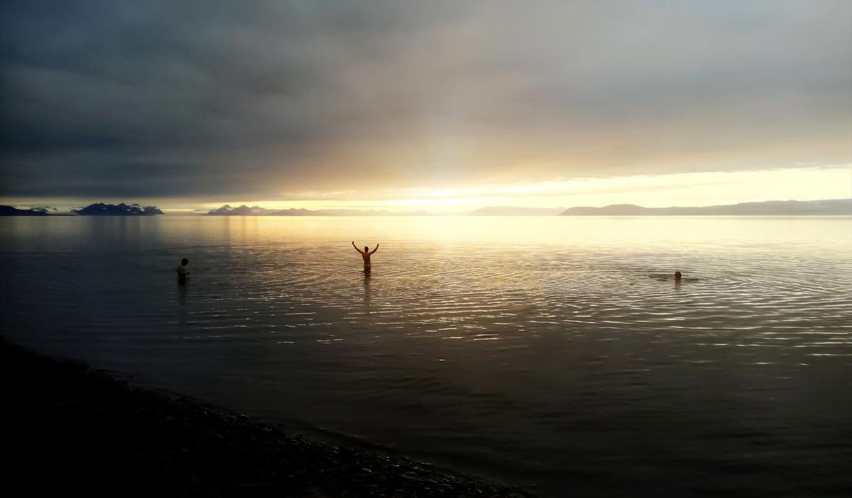 Now the fun starts! We dive, swim, dip or even go all the way under! Our guide will be on guard for Polar bear protection, and will have some nice hot drinks ready for you, whilst you will be in your cozy bathrobes watching the midnight sun and enjoying the beautiful Arctic scenery.