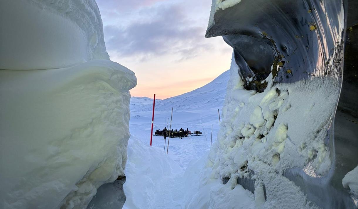 The hum of the snowmobile against the crisp snow is an amazing feeling while you will be with your own thoughts and enjoying the beautiful majestic valleys we pass by. We will have a stop on the way and we might even be able to spot a bit of the Arctic wildlife with a reindeer or a snowfox on our way. At the foot of Tellbreen, we will stop the snowmobiles and continue the journey on foot into the ice cave. As soon as we reach the entrance there is no noise, no rush – only the sound of snow beneath you and the sculpted ice formations. Every frozen ripple tells a story – of movement, of pressure, of time itself. The ice has been formed by meltwater channels through 1000 of years and it is known for its stunning ice formations and historical insights. Your guide will serve a warm drink and warm lunch before riding back and we will breathe in the cold Arctic air and think of this beautiful natural ice sculpture we have just witnessed.