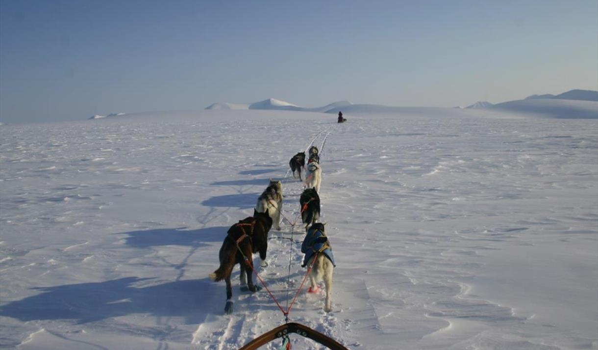 Day one we'll travel through wide valleys and over glaciers. Lunch will be served close to a very beautiful ice cave which we will visit. Thereafter we continue over a mountain pass with spectacular views before we sled down to our cozy lodge in Tverrdalen, where no other human installations exist. Here we enjoy the fire in the oven and relax with a better meal while our faithful huskies placed outside around the lodge serve as our trustful polar bear guards.