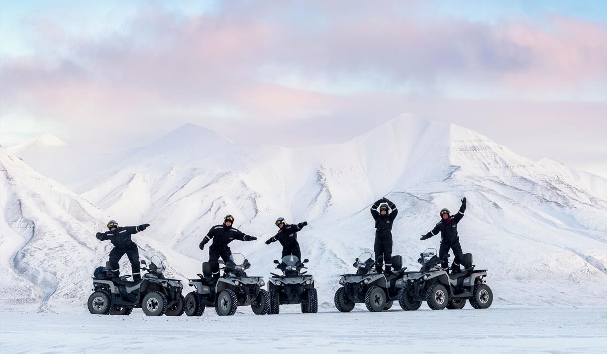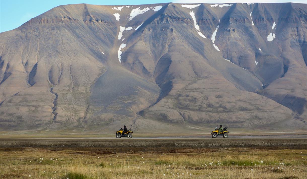 We drive our ATVs into a classic Svalbard landscape in Adventdalen, a valley shaped by glaciers and surrounded by mountains and interesting cultural monuments. We regularly see both Svalbard reindeers and Arctic foxes on this trip.