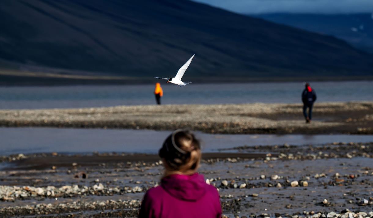 Join us on an evening bird and wildlife observation at the bird laguna close to the Isfjord. When the busy daytime has gone, the peace and calmness comes back to the bird laguna where many different birds are nesting. The Arctic tern for example, with the longest migration among birds in the world can be found here, as many other birds.