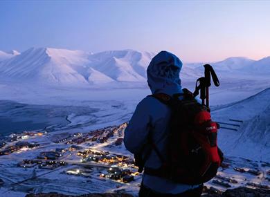We start from the top of town in Nybyen and walk up to the glacier. After hiking uphill for ca 2 hours and covering 350 highmeters we reach the entrance to the cave. Here we will dress us with safety equipment like helmet, spikes and head light before we continue down to the cave.