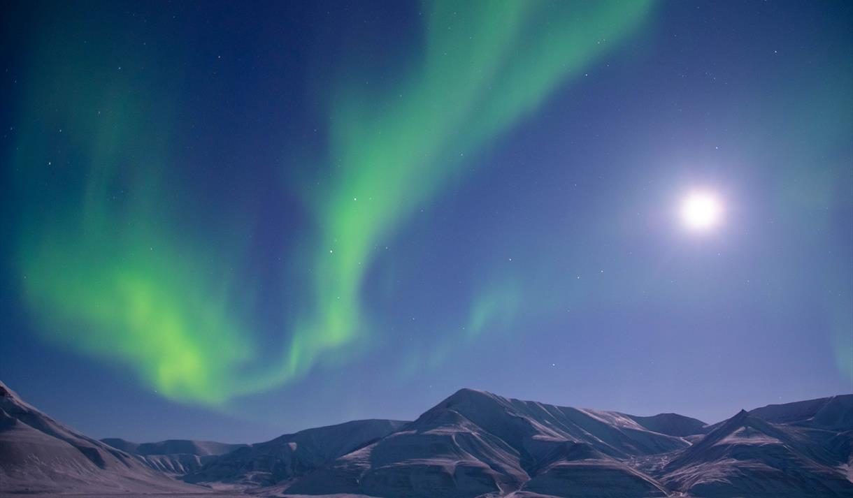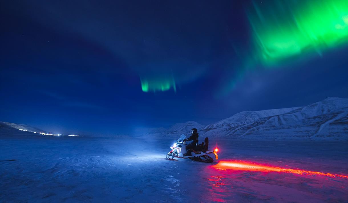 Arctic silence awaits as we leave behind the lights of Longyearbyen and glide into the darkness, illuminated only by moonlight, stars, and our snowmobiles.