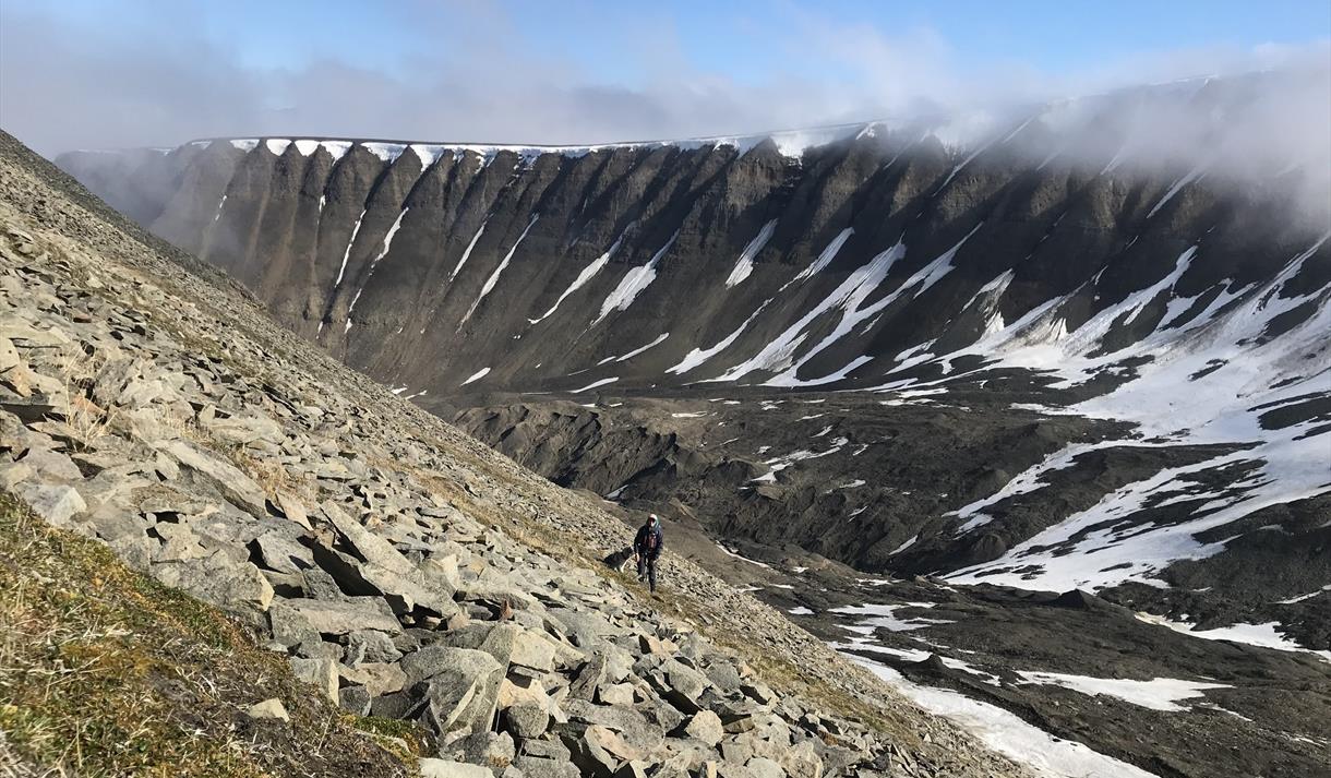 We will pick you up at the hotel you're staying at and drive to Nybyen at the top of Longyearbyen to the South. In Nybyen we prepare for the hike and start by crossing the meltwater river nearby. Then we start on the ascent of the eastern slope of Sarkofagen. After a slightly steep part we're rewarded by a relaxing walk along the slope of the moraine towards the glacier Larsbreen. After a while we get to a final slope which will take us to the top of the mountain.