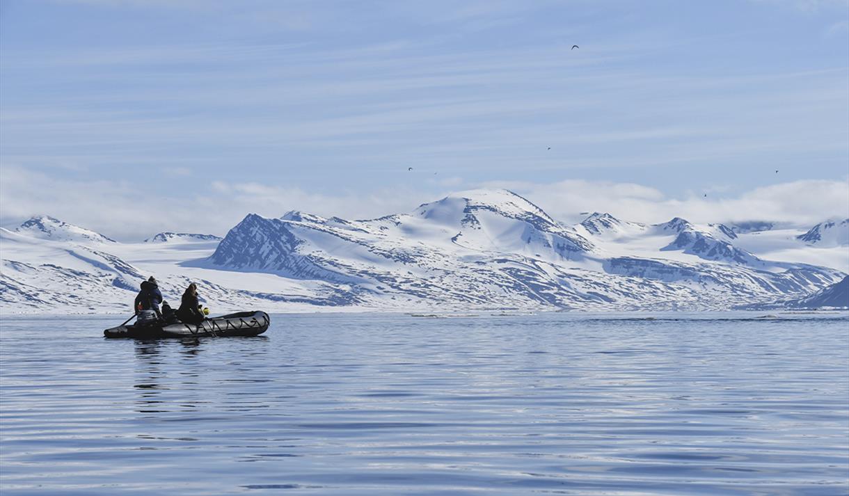• Four persons in a rubber boat on a calm fjord with snow-covered mountains in the background
