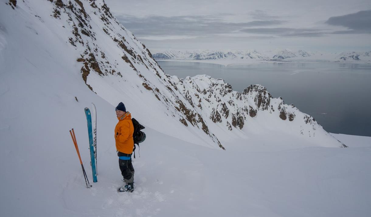 You can drink your morning coffee with the most spectacular views, maybe spotting wildlife like whales or Arctic birds before skis are strapped on and you will be just steps from the shoreline and the climb begins.