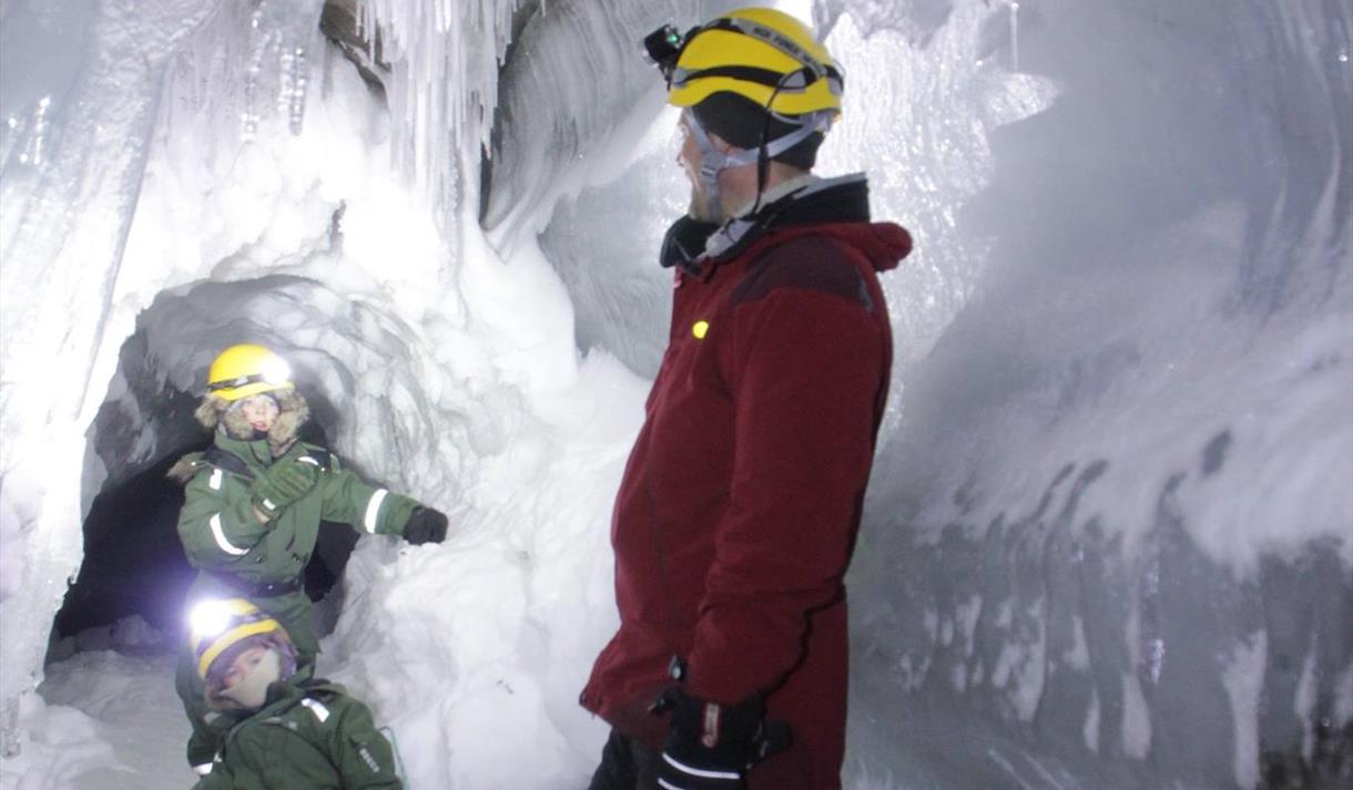 We will pick you up by car at your accommodation in town and drive through the historical Adventdalen to our kennel in Bolterdalen. Here you will get what you need of warm clothing (insulated overall, hat, mittens, winter boots and headlamps). You will get all the necessary instruction for safe travel with your dog team. During the trip, we serve a warm lunch, warm drinks, and biscuits inside our igloo or together with the dogs out in the sun. After visiting the ice cave, we will travel back to the dog yard and be back in town again around 16:00.